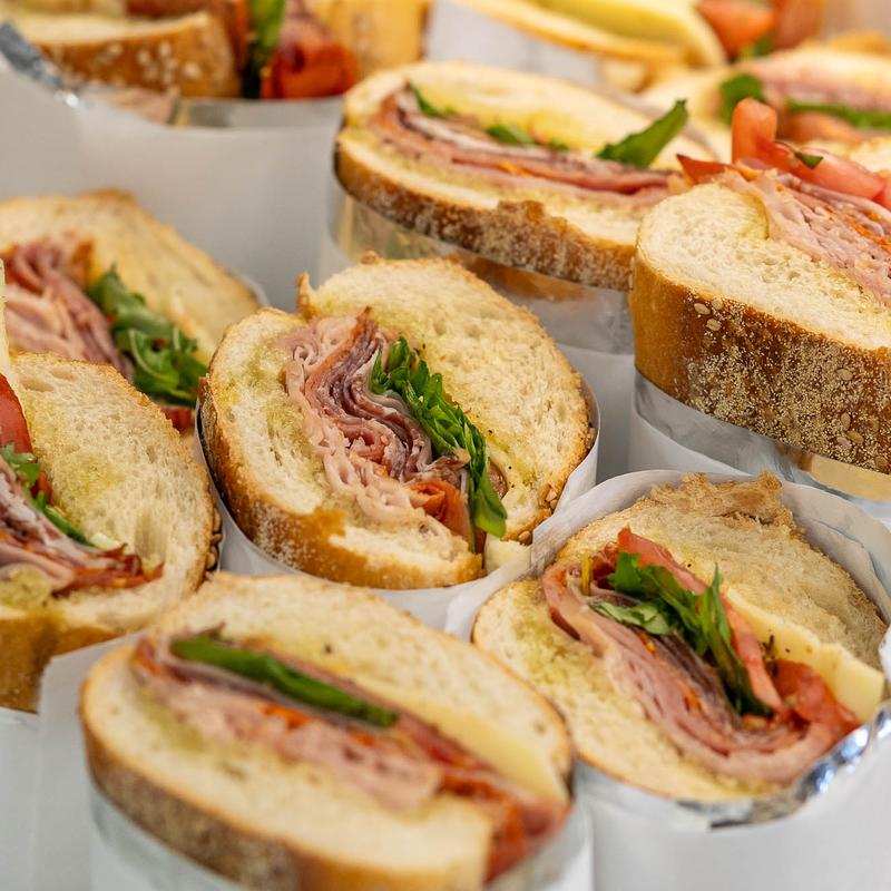 Feeds 4-6 $65.00 | Feeds 8-10 $130.00 • Seeded Italian. Chilled, Assorted Artisan sandwiches: Italian, chicken cutlet and roasted pepper, brie and grilled chicken, roast beef and fresh mozzarella, prosciutto and burrata.